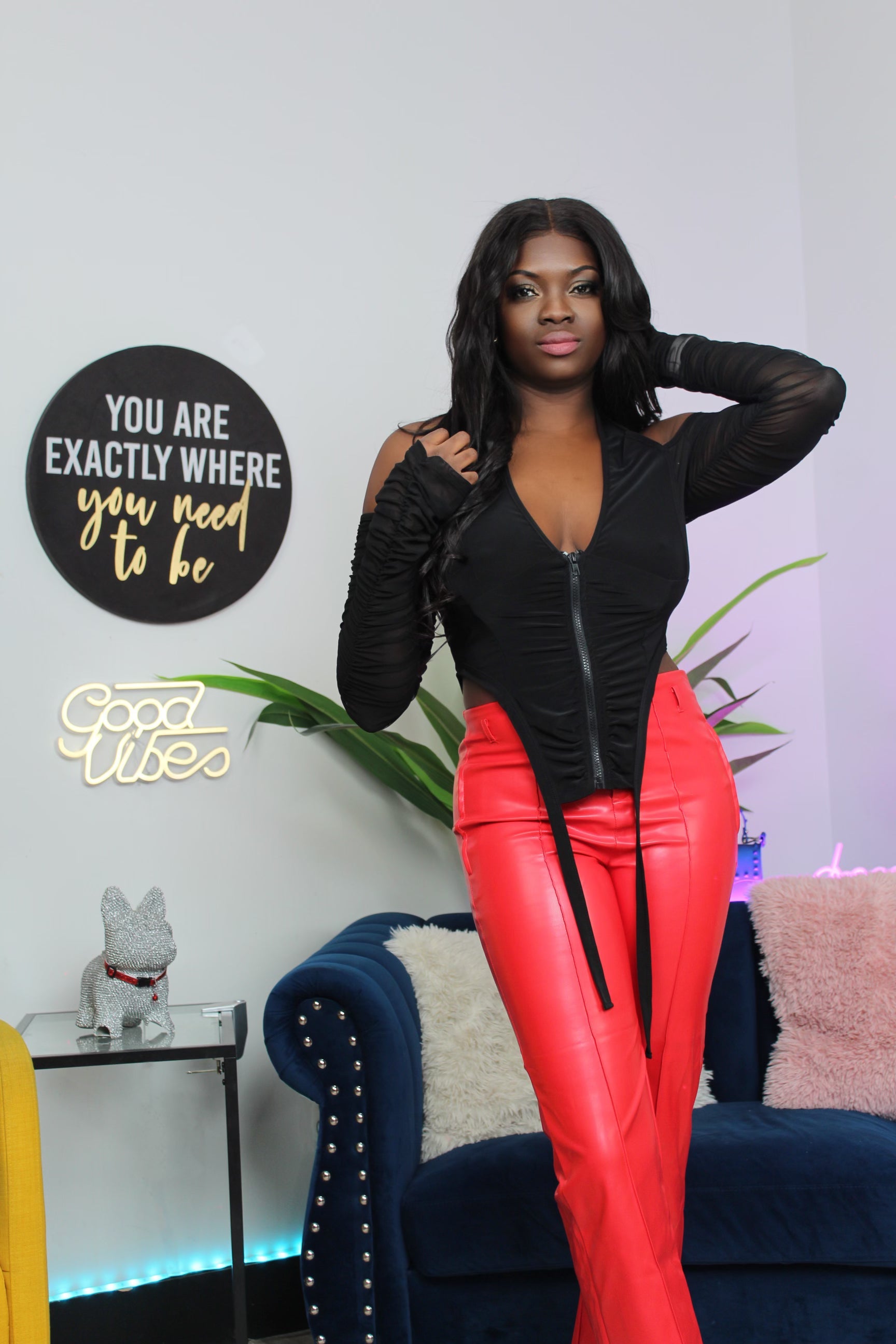 Halter neck. Off shoulder long meshed sleeve. Zipped up front